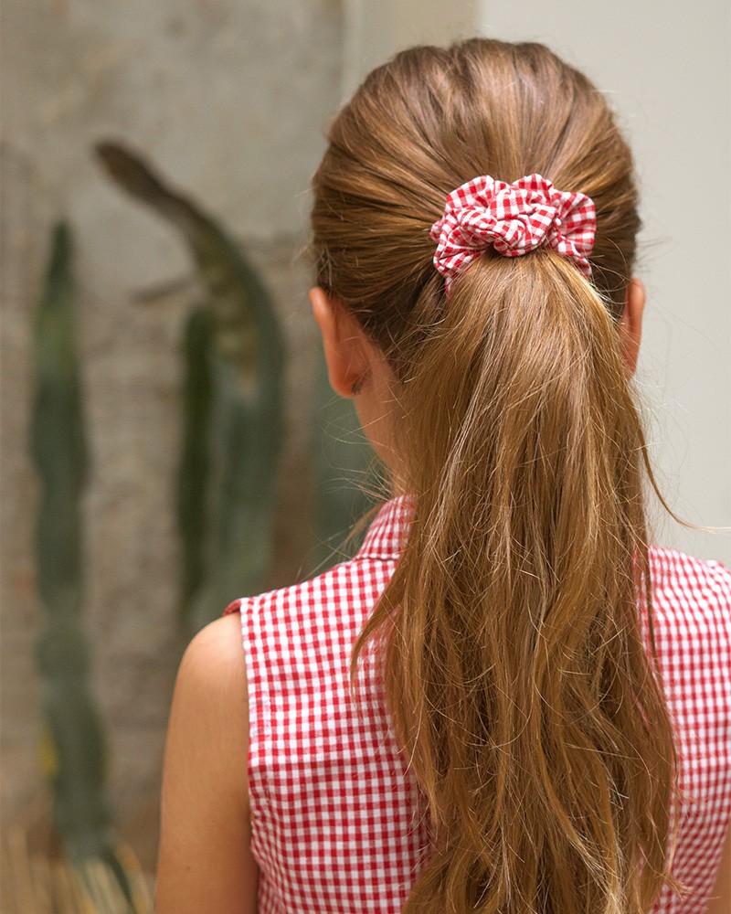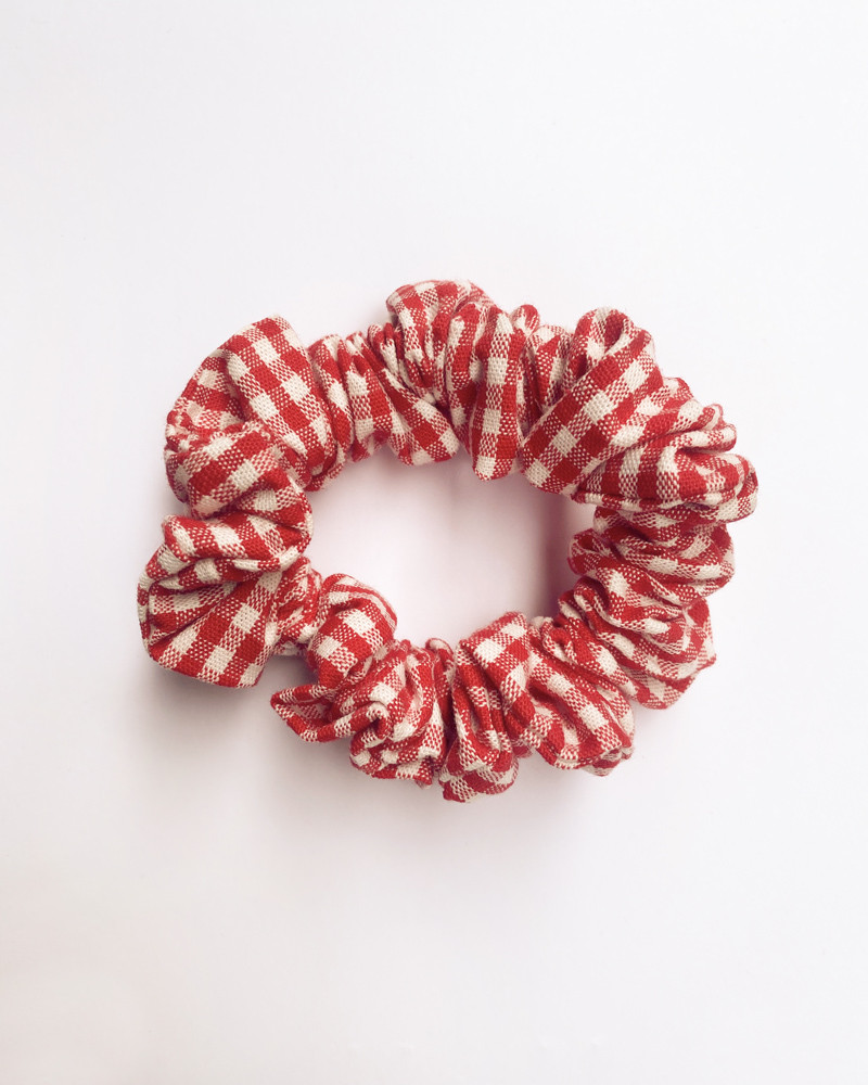 Coletero de cuadro vichy blanco y rojo. Un scrunchie atemporal y muy combinable para múltiples usos, coletas, moños, trenzas, como pulsera...