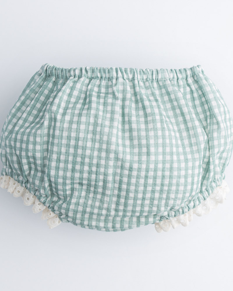 Braguita de algodón. Prenda básica para los más pequeños. Hecha a mano en un tejido de vichy clásico turquesa con detalle de puntilla