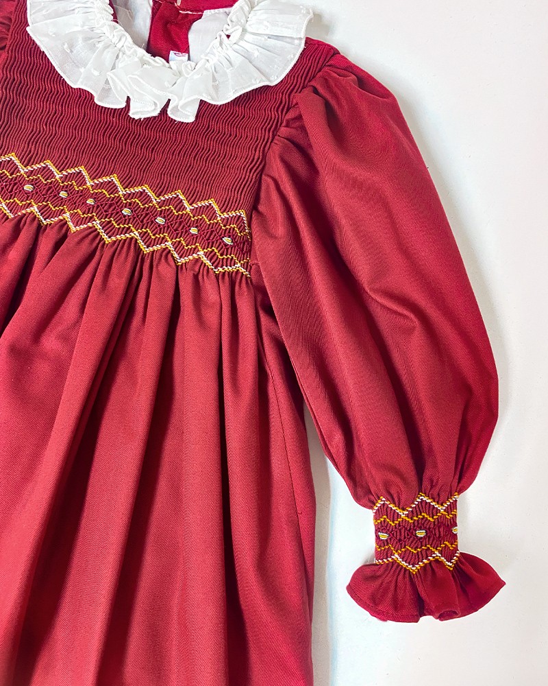 Vestido para niña rojo con detalles de punto smock en mangas y pecho ideal para eventos navideños.