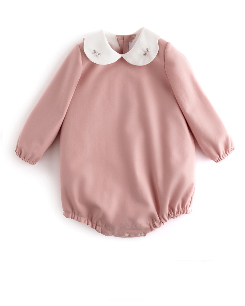 Ranita rosa con cuello blanco y detalle de bordado floral.