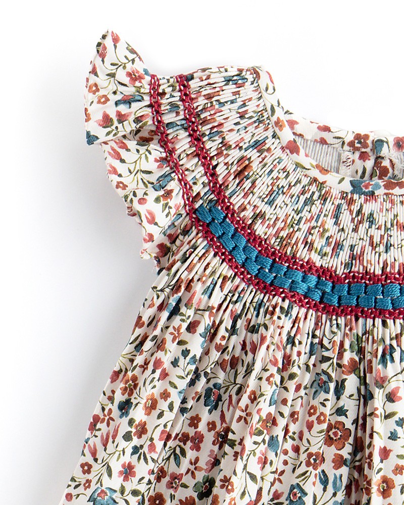 Jesusito compuesto por blusa y braguita de estampado floral mini con detalle de punto smock en azul.