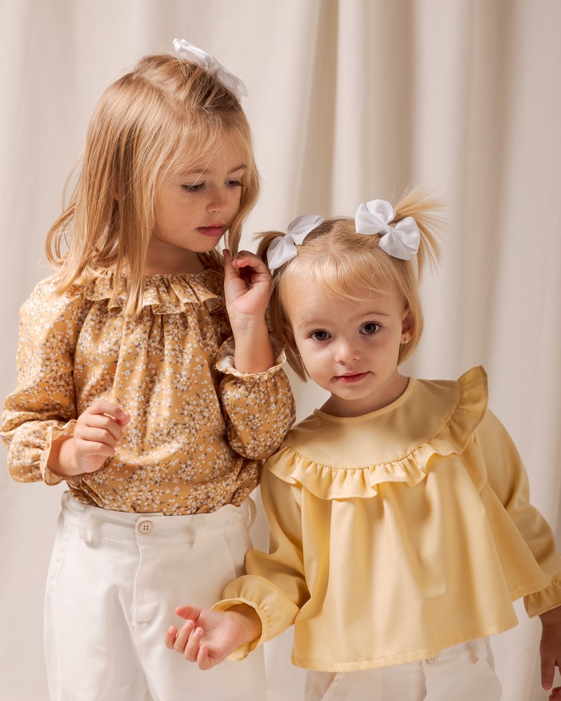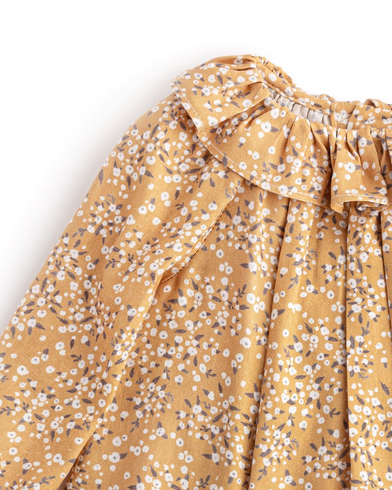 Camisa para niña con estampado floral en tono ocre y blanco con detalles de volantes en cuello y mangas. Una camisa perfecta para el otoño, que combinará genial con pantalones o faldas en blanco o marrones.