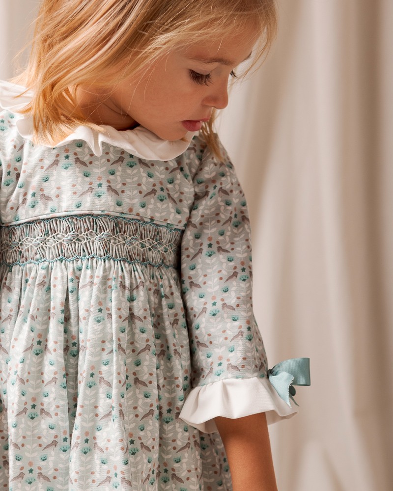 Vestido para niña de estampado floral en tonos azules con nidos de abeja y detalle de volante blanco y lazos azules en mangas.