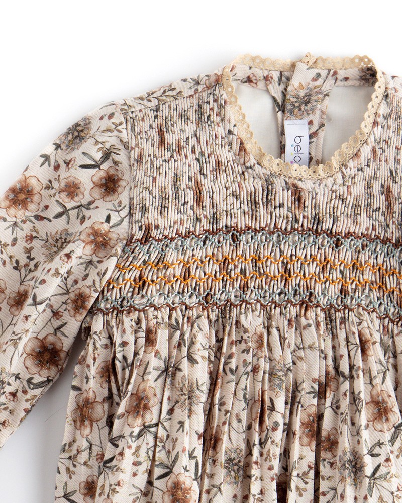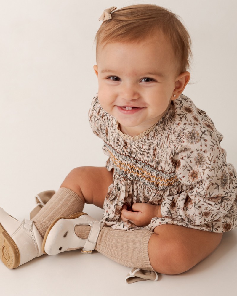 Ranita para niña bebé con tejido lurex de estampado floral con punto smock en el pecho. Ideal para el otoño.