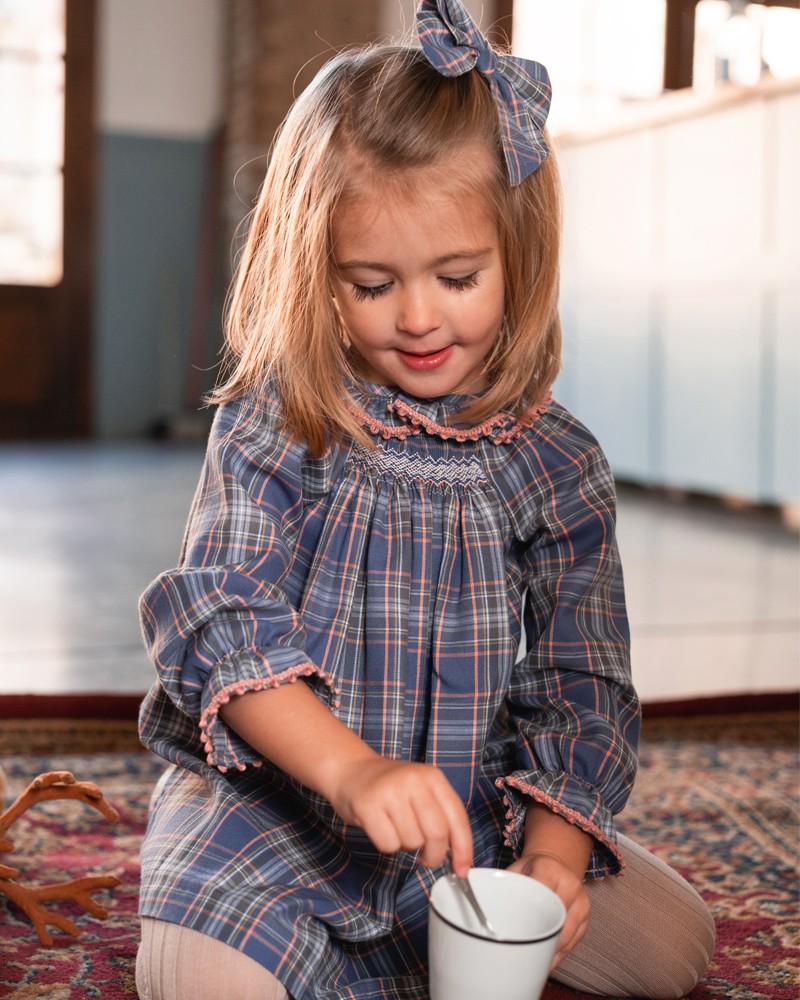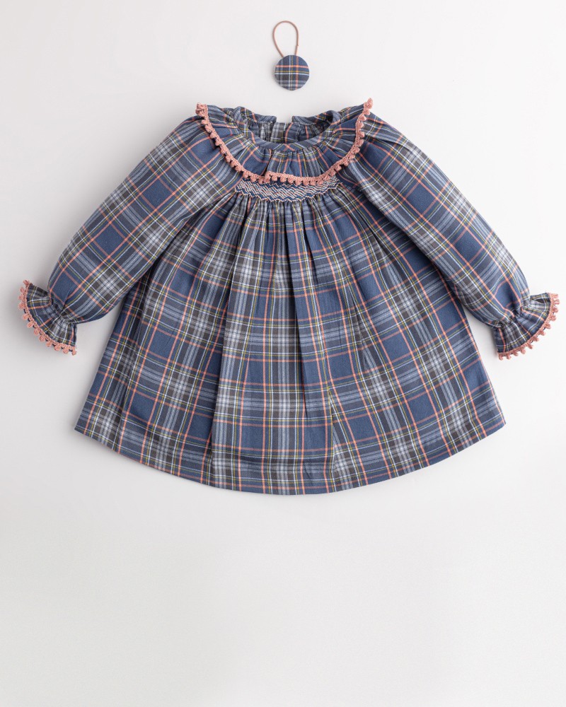Jesusito muy versátil con tejido de cuadros sobre fondo azul con detalles de puntilla en cuello y puños de color rosa.