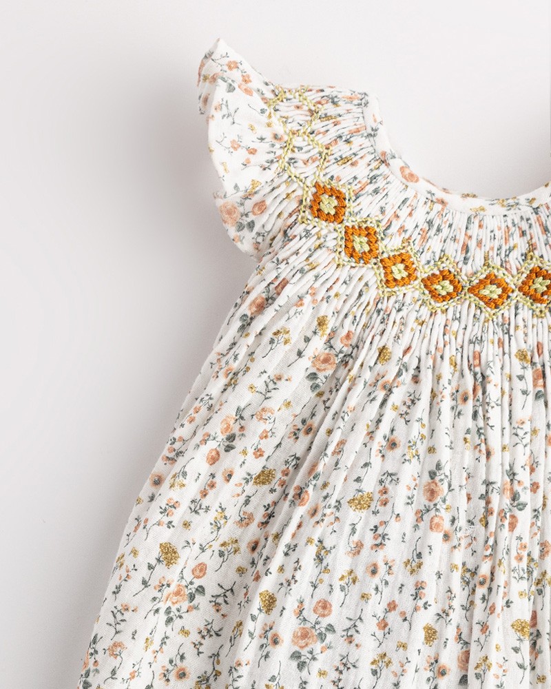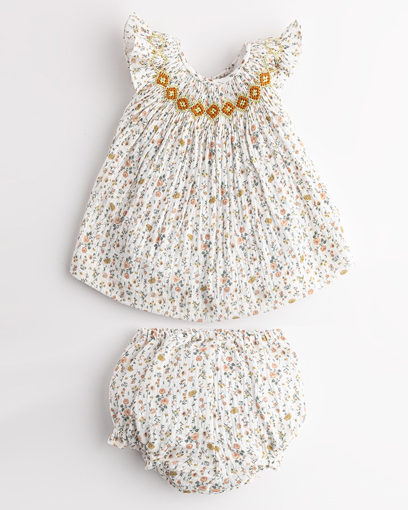 Precioso jesusito de estampado floral y detalle de punto smock geométrico en el pecho en tonos naranjas con braguita a juego.