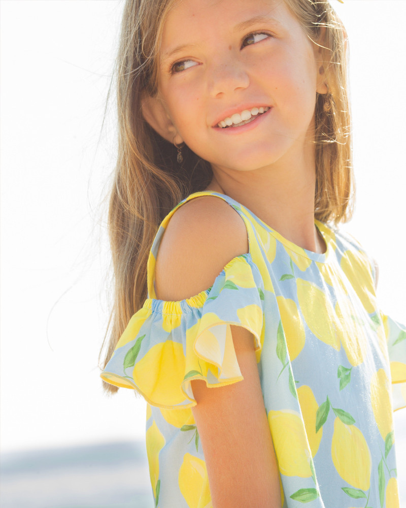 Vestido con un hermoso diseño de manga caída y hombro descubierto. El estampado tan fresco y en tonos combinados, hacen a esta, una de las prendas favoritas
