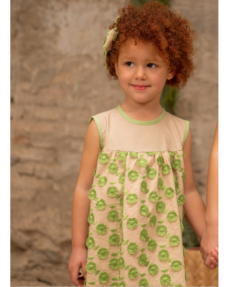 Vestido de un bonito algodón orgánico bordado en color verde brillante sobre una base beige, haciendo una combinación perfecta