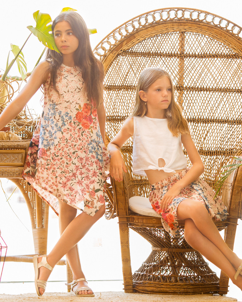 Vestido para niña con un bonito diseño asimétrico con un estampado floral de estilo Patchwork. Una prenda muy fresca y fácil de llevar