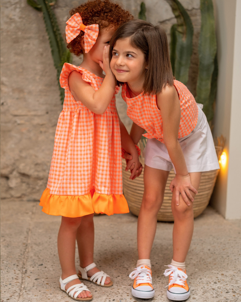 Vestido con un estampado brillante de flúor anaranjado. Con un diseño elegante pero con un color atrevido. Una prenda estrella