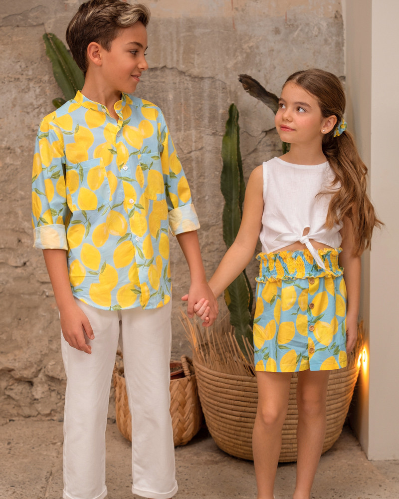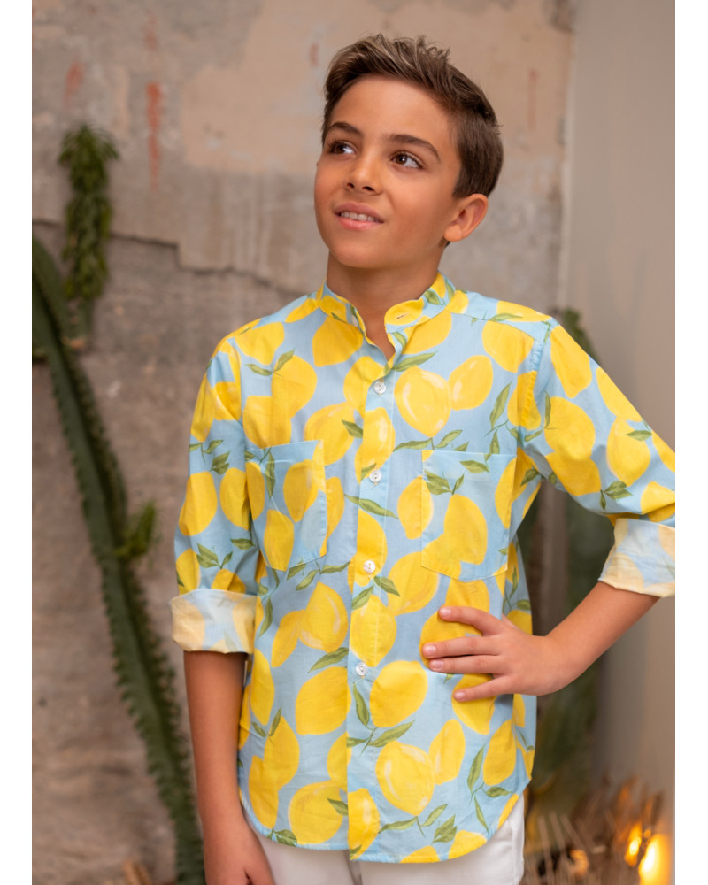 Camisa de algodón, muy ligero y rico al tacto. Con un divertido estampado y colorido. Mangas ajustables con botón para acortartlas